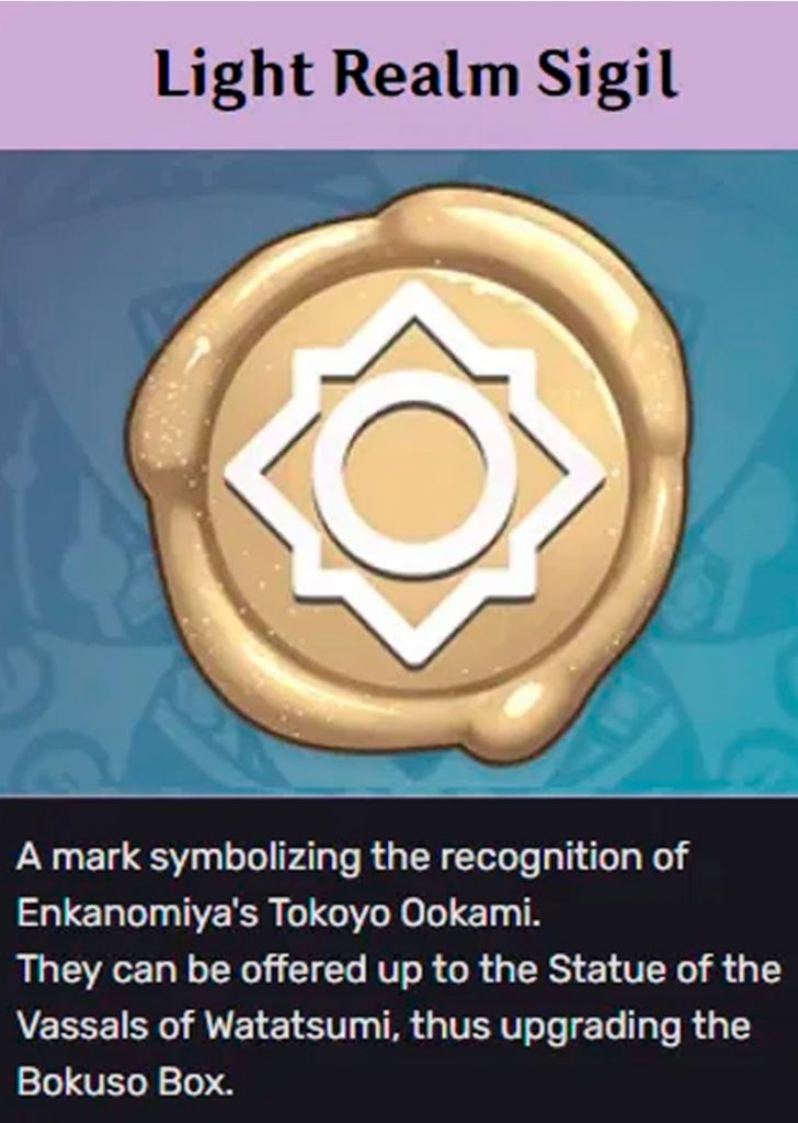 Otro de los elementos que prueban la existencia y estadía de Tokoyo en Enkanomiya son las Insignias del Reino de Luz.